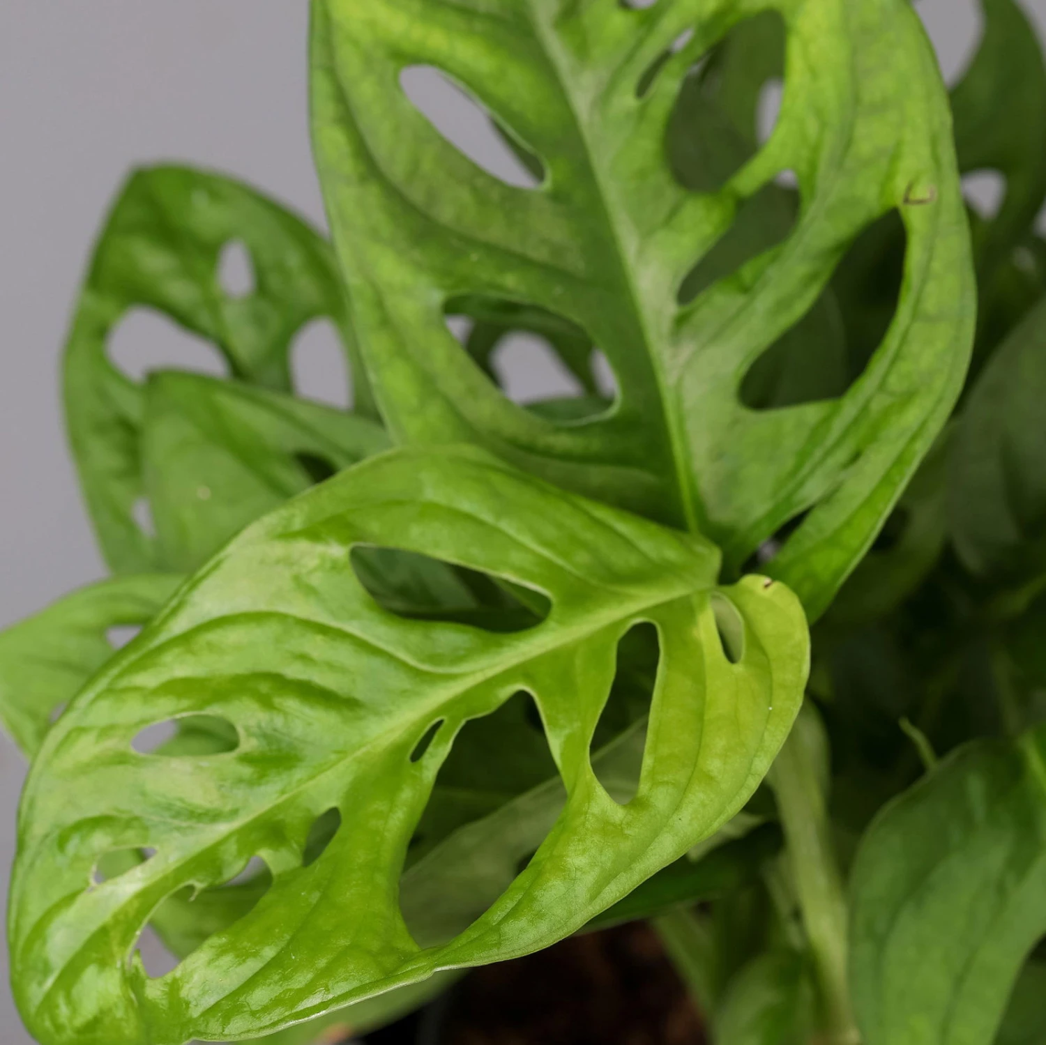 Das Schiefe Fensterblatt (Monstera adansonii) gilt als absolute Trendpflanze und bietet mit seiner außergewöhnlichen Optik die optimale Grundlage für echtes Dschungelfeeling in Ihrem Zuhause. Charakteristisch sind die elliptischen, zugespitzten Blätter, welche von mehreren Durchbrüchen durchzogen sind. Das verleiht der Pflanze ihr löchriges Aussehen und ihren Beinamen ‚Swiss Cheese Plant‘ (zu deutsch: ‚Schweizer Käse-Pflanze‘). Die Blätter sind kräftig grün uns sitzen an langen Stielen. Die Monstera ist eine Kletter- und Rankpflanze und bildet Luftwurzeln aus, mit denen sie sich in der Natur an Felsen und Baumstämmen emporrankt. Bei der Zimmerkultur kann der Pflanze eine Rankhilfe in Form eines Moosstabs zur Verfügung gestellt werden. Ohne Rankhilfe wächst das Fensterblatt überhängend und kann auch in einer Blumenampel kultiviert werden. Kletternd kann die Pflanze Höhen von bis zu 3 Metern erreichen.