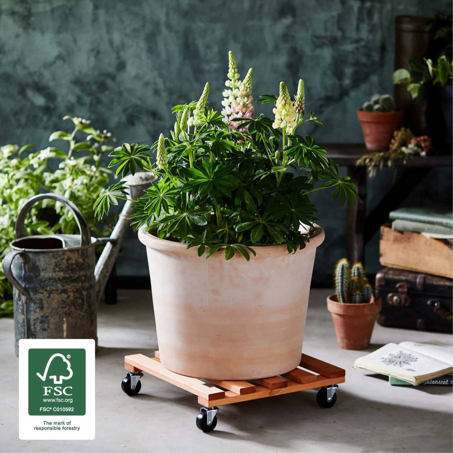 Dieser praktische Pflanzenroller verleiht Ihrer Innen- oder Außenbegrünung ein Plus an Mobilität. Der Multi Roller überzeugt mit einer Tragkraft von bis zu 120 Kilogramm und einer stabilen Oberfläche aus dem FSC®-zertifizierten Kiefernholz. Das Holz ist witterungsbeständig, langlebig und erfordert nahezu keine Pflege.